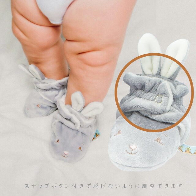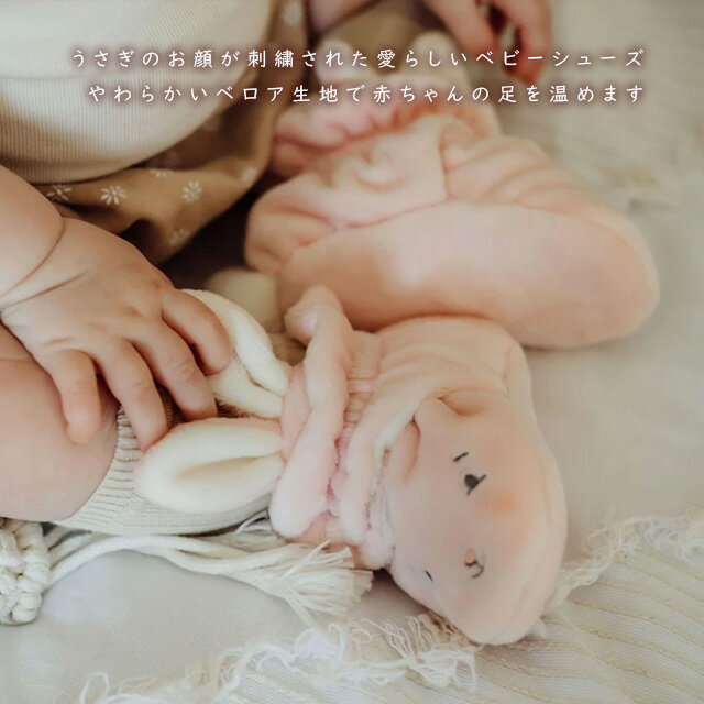 参考サイズサイズ日本対応サイズ体重足サイズ0-3M50-603-6kg7-9cm3-6M60-706-9kg9-11cm6-12M70-809-11kgうさぎのふわふわベビースリッパ うさぎのお顔が刺繍されたかわいいベビーシューズ。