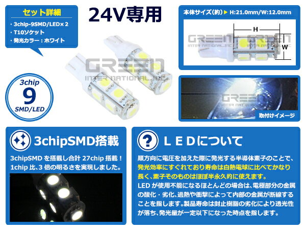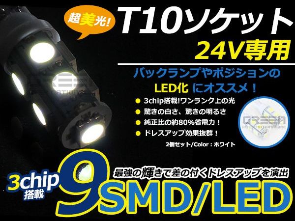簡単交換 汎用 LED球 カスタムパーツ ドレスアップパーツ【商品詳細】・カラー:ホワイト 白・形状:T10・LEDタイプ:9連・仕様:24V【商品説明】【商品説明】24V車対応 LEDバルブ 2個セット24V対応なので、バス、トラック、ダンプ、デコトラにオススメ!消費電力も少なく、バッテリーへの負担を削減!寿命は白熱電球に比べてかなり長く、素子そのものは半永久的に使えます。